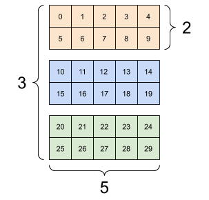 tf.Tensor( [[[ 0 1 2 3 4] [ 5 6 7 8 9]] [[10 11 12 13 14] [15 16 17 18 19]] [[20 21 22 23 24] [25 26 27 28 29]]], shape=(3, 2, 5), dtype=int32)
