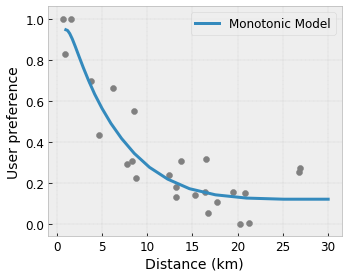- Monotonisitas : Anda dapat menentukan bahwa keluaran hanya boleh bertambah/berkurang terhadap suatu masukan. Dalam contoh kami, Anda mungkin ingin menentukan bahwa peningkatan jarak ke kedai kopi hanya akan menurunkan prediksi preferensi pengguna.