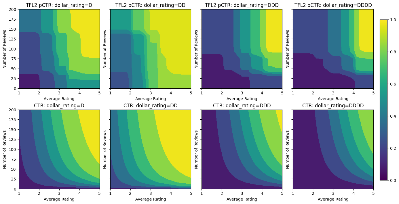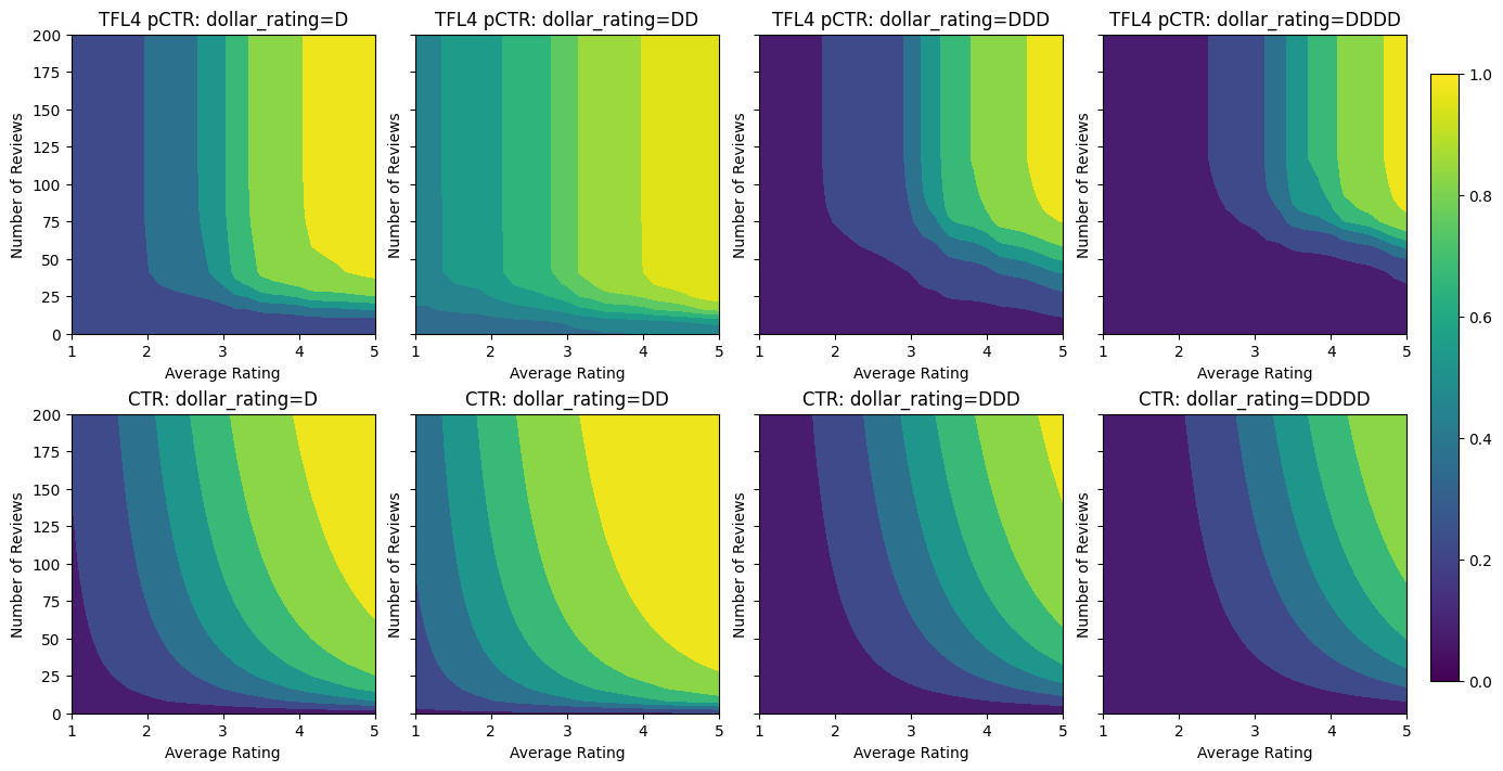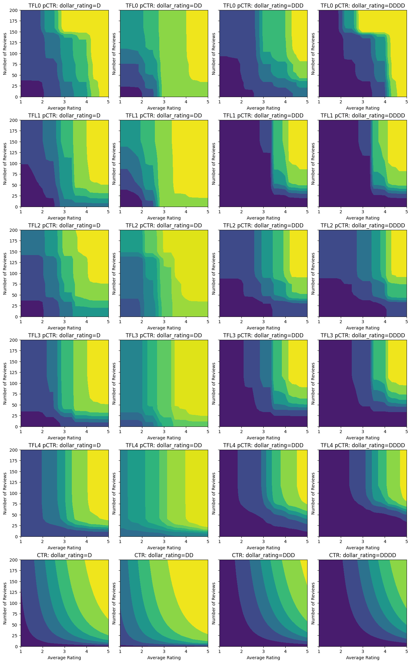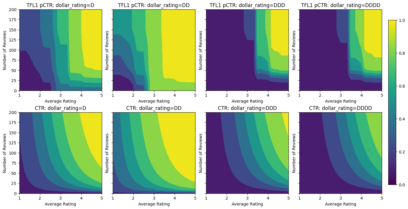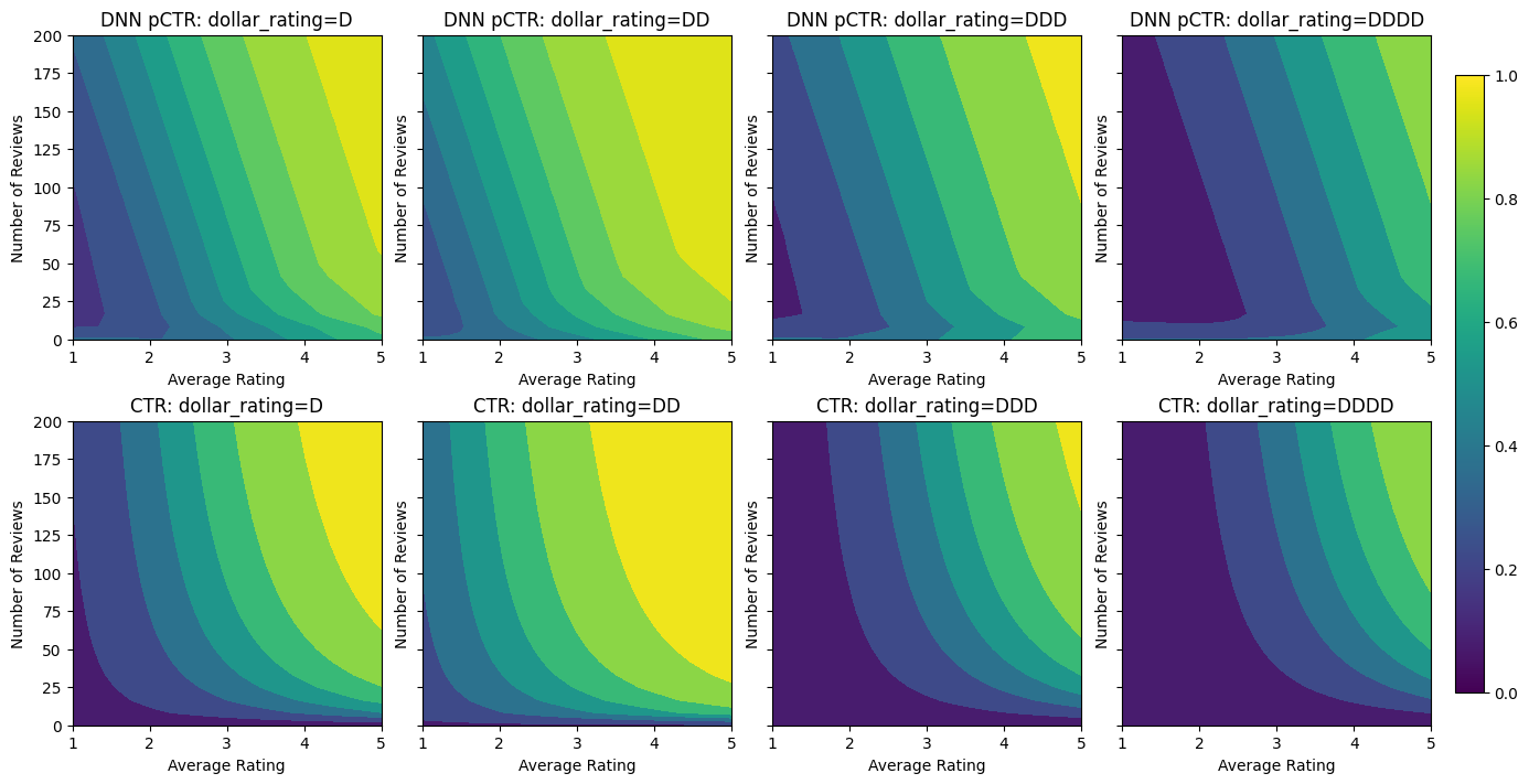 This formula reflects typical user patterns. e.g. given everything else fixed, users prefer restaurants with higher star ratings, and "\$\$" restaurants will receive more clicks than "\$", followed by "\$\$\$" and "\$\$\$\$".