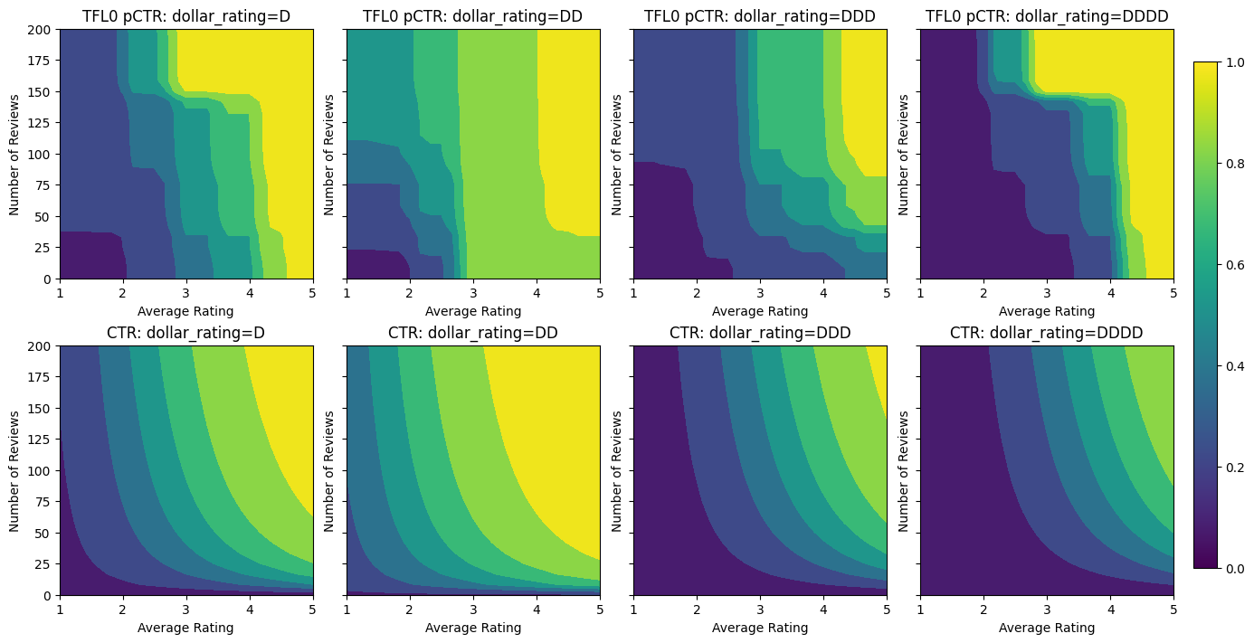 With the constraints added, the estimated CTR will always increase as the average rating increases or the number of reviews increases. This is done by making sure that the calibrators and the lattice are monotonic.