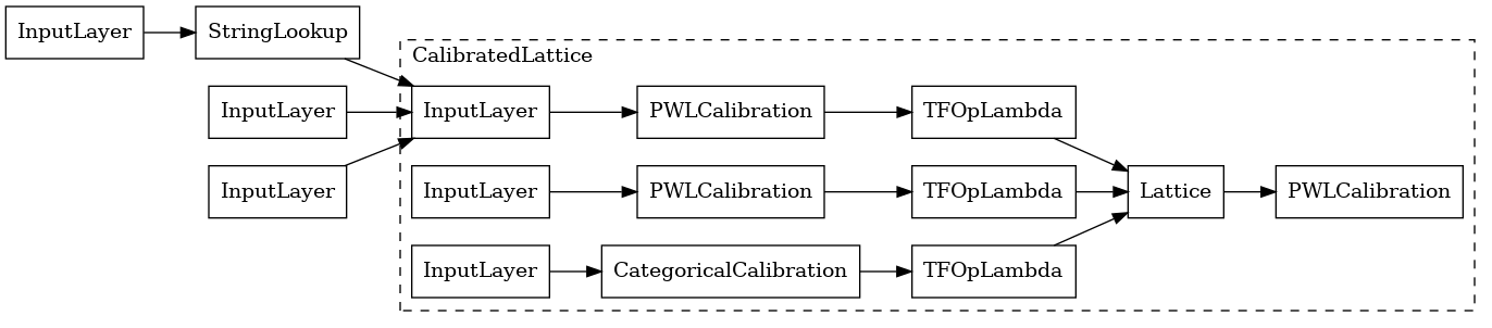 Using a CalibratedLatticeConfig creates a premade classifier that first applies a calibrator to each input (a piece-wise linear function for numeric features) followed by a lattice layer to non-linearly fuse the calibrated features. We have also enabled output piece-wise linear calibration.