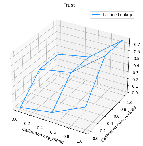 We can exercise TFL trust constraints to inform the model that the larger (or smaller) value of one feature indicates more reliance or trust of another feature. This is done by setting reflects_trust_in configuration in the feature config.