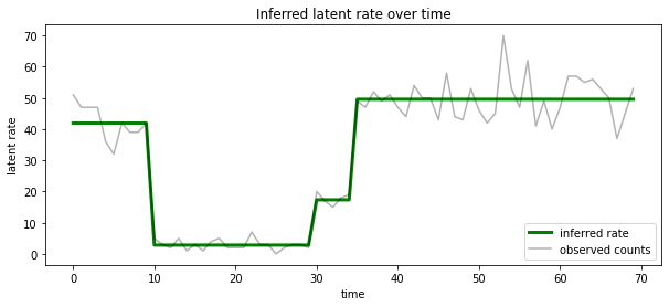 Inferred rates: [ 2.8302798 49.58499 41.928307 17.35112 ] True rates: [40, 3, 20, 50]