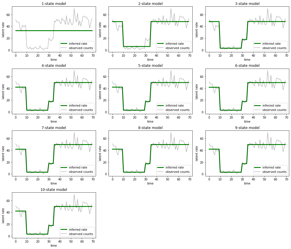 It's easy to see how the one-, two-, and (more subtly) three-state models provide inadequate explanations. Interestingly, all models above four states provide essentially the same explanation! This is likely because our 'data' is relatively clean and leaves little room for alternative explanations; on messier real-world data we would expect the higher-capacity models to provide progressively better fits to the data, with some tradeoff point where the improved fit is outweighted by model complexity.