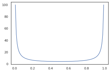 plt.plot(x, jit(grad(lambda x: vmap(tfb.Sigmoid().inverse)(x).sum()))(x))