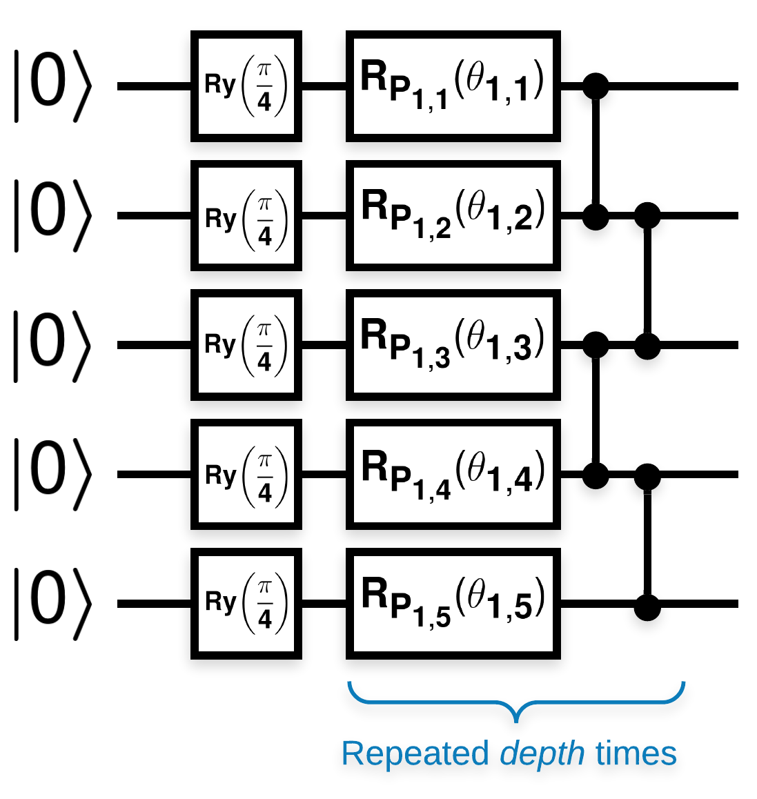 Random quantum circuits with many blocks that look like this (\(R_{P}(\theta)\) is a random Pauli rotation):