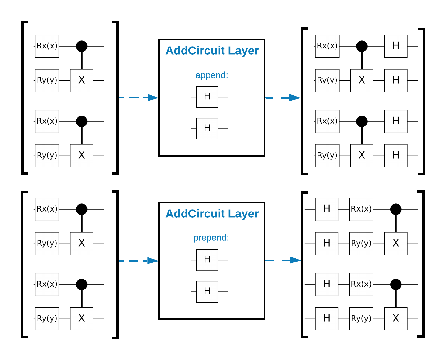 TensorFlow Quantum (TFQ) proporciona clases de capas diseñadas para la construcción de circuitos en el gráfico. Un ejemplo es la capa tfq.layers.AddCircuit que hereda de tf.keras.Layer . Esta capa puede anteponerse o agregarse al lote de circuitos de entrada, como se muestra en la siguiente figura.