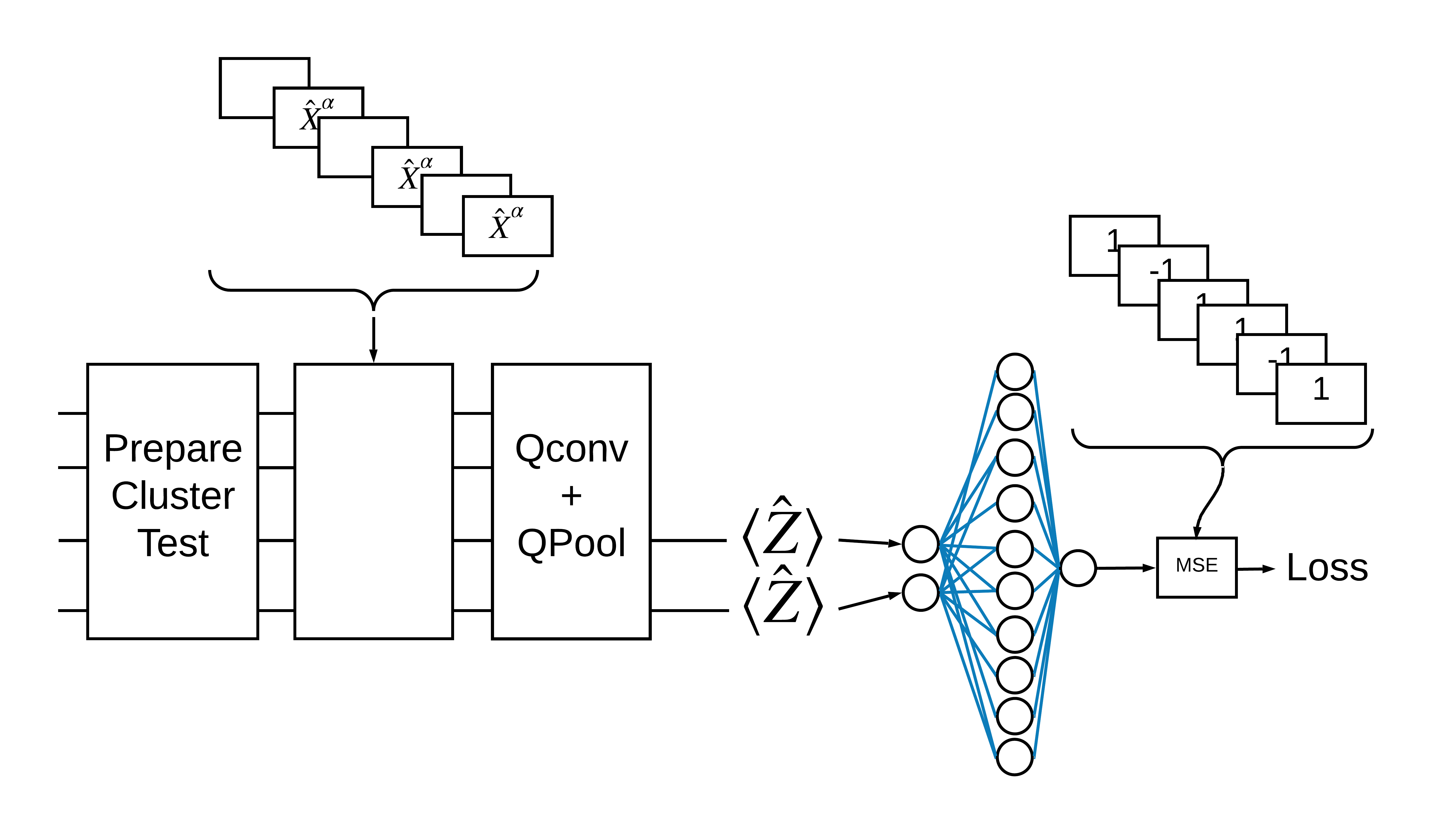 Aplique una capa de convolución cuántica, leyendo \(\langle \hat{Z}_n \rangle\) en todos los bits, seguido de una red neuronal densamente conectada.