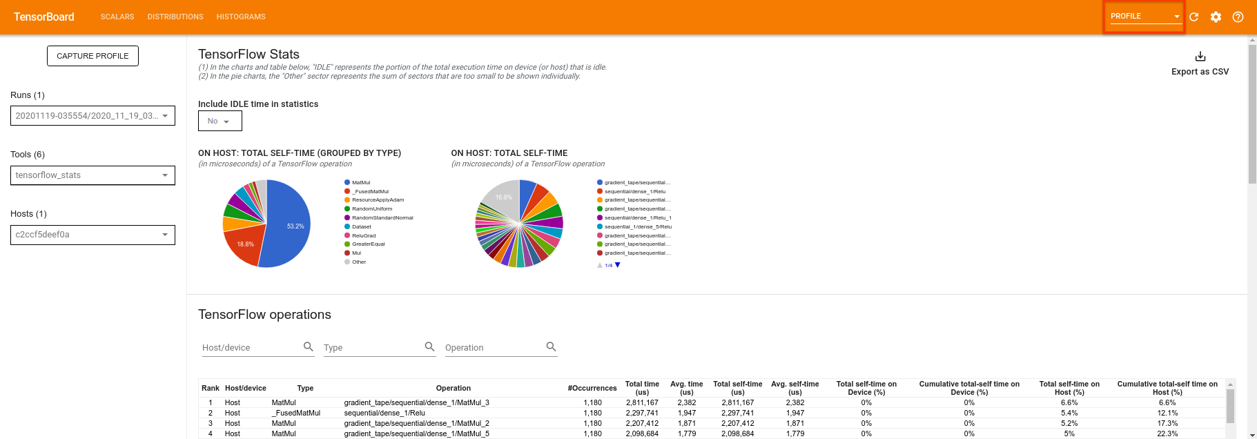 O TensorBoard fará o perfil de todo o código entre tf.profiler.experimental.start e tf.profiler.experimental.stop . Esses dados de perfil podem ser visualizados na página de profile do TensorBoard: