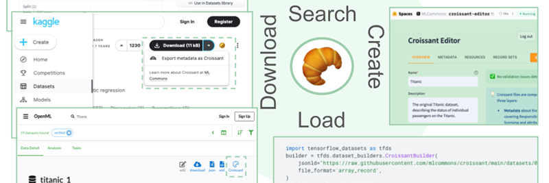 Utilisez TensorFlow Datasets CrossaintBuilder pour définir les métadonnées Croissant, un format qui s'appuie sur la structure schema.org et combine les descriptions des fichiers de ressources, la structure des données et la sémantique ML par défaut dans un seul fichier.