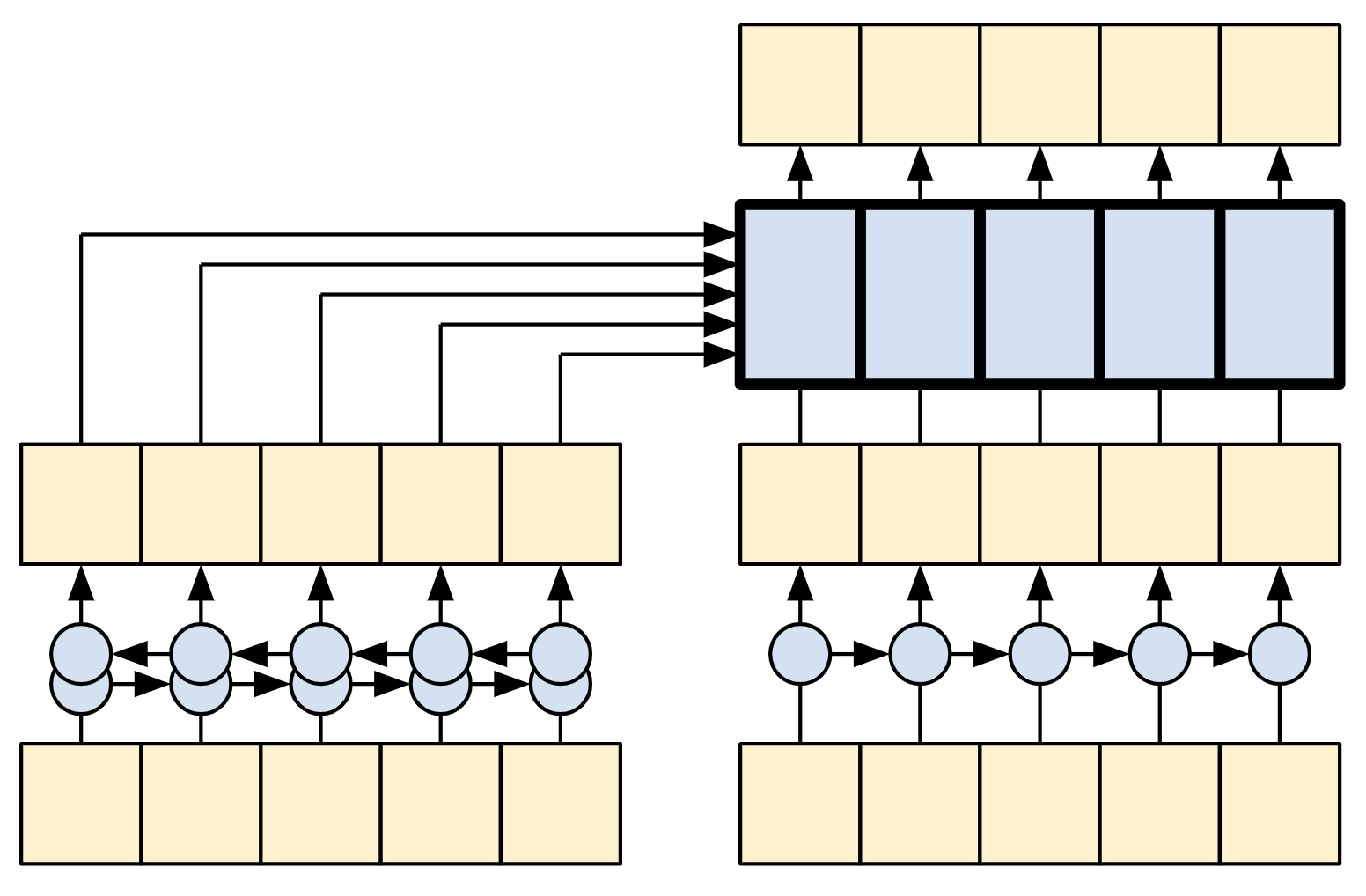 Neural networks for machine translation typically contain an encoder reading the input sentence and generating a representation of it. A decoder then generates the output sentence word by word while consulting the representation generated by the encoder. The Transformer starts by generating initial representations, or embeddings, for each word... Then, using self-attention, it aggregates information from all of the other words, generating a new representation per word informed by the entire context, represented by the filled balls. This step is then repeated multiple times in parallel for all words, successively generating new representations.