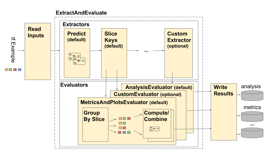 להלן דוגמה לשלבים המעורבים בצינור החילוץ וההערכה כאשר נעשה שימוש גם ב- tfma.evaluators.MetricsAndPlotsEvaluator וגם tfma.evaluators.AnalysisTableEvaluator :