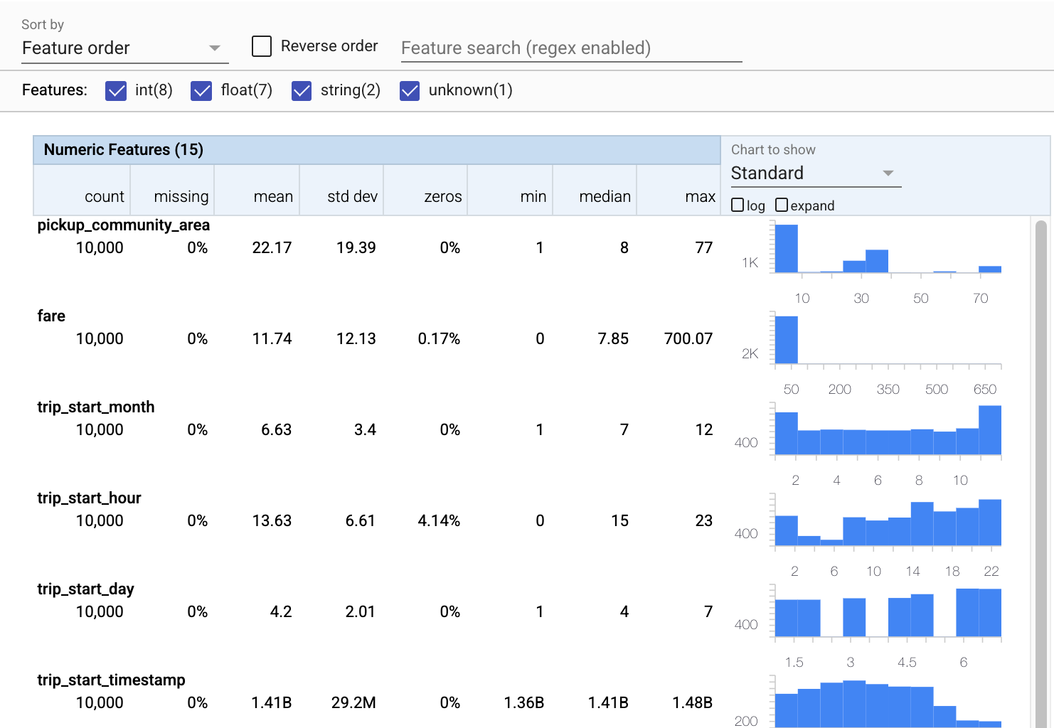 - 各機能に、トレーニングデータセットと評価データセットの両方の統計が含まれていることに注意してください。