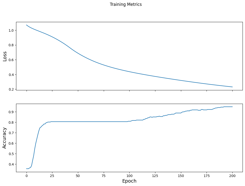 Epoch 000: Loss: 1.071, Accuracy: 35.581% Epoch 050: Loss: 0.688, Accuracy: 80.524% Epoch 100: Loss: 0.437, Accuracy: 80.899% Epoch 150: Loss: 0.319, Accuracy: 88.764% Epoch 200: Loss: 0.231, Accuracy: 94.757%