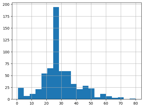 dftrain.age.hist(bins=20)
