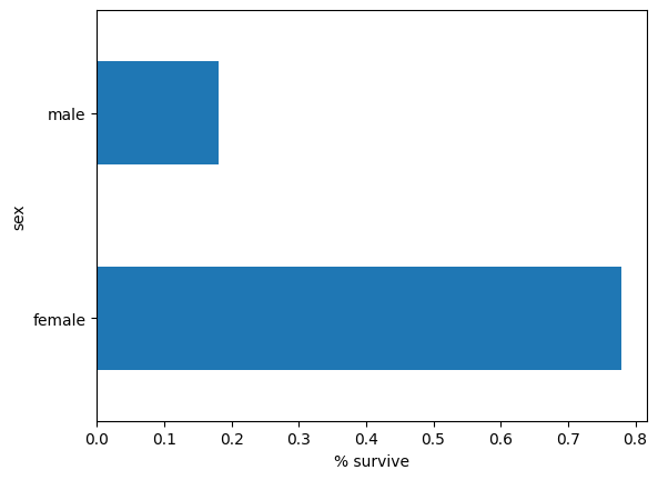 pd.concat([dftrain, y_train], axis=1).groupby('sex').survived.mean().plot(kind='barh').set_xlabel('% survive')