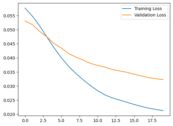 Epoch 1/20 5/5 ━━━━━━━━━━━━━━━━━━━━ 5s 551ms/step - loss: 0.0581 - val_loss: 0.0531 Epoch 2/20 5/5 ━━━━━━━━━━━━━━━━━━━━ 0s 13ms/step - loss: 0.0553 - val_loss: 0.0518 Epoch 3/20 5/5 ━━━━━━━━━━━━━━━━━━━━ 0s 13ms/step - loss: 0.0519 - val_loss: 0.0494 Epoch 4/20 5/5 ━━━━━━━━━━━━━━━━━━━━ 0s 13ms/step - loss: 0.0480 - val_loss: 0.0475 Epoch 5/20 5/5 ━━━━━━━━━━━━━━━━━━━━ 0s 13ms/step - loss: 0.0441 - val_loss: 0.0451 Epoch 6/20 5/5 ━━━━━━━━━━━━━━━━━━━━ 0s 13ms/step - loss: 0.0405 - val_loss: 0.0435 Epoch 7/20 5/5 ━━━━━━━━━━━━━━━━━━━━ 0s 13ms/step - loss: 0.0374 - val_loss: 0.0415 Epoch 8/20 5/5 ━━━━━━━━━━━━━━━━━━━━ 0s 13ms/step - loss: 0.0347 - val_loss: 0.0403 Epoch 9/20 5/5 ━━━━━━━━━━━━━━━━━━━━ 0s 13ms/step - loss: 0.0323 - val_loss: 0.0392 Epoch 10/20 5/5 ━━━━━━━━━━━━━━━━━━━━ 0s 13ms/step - loss: 0.0303 - val_loss: 0.0380 Epoch 11/20 5/5 ━━━━━━━━━━━━━━━━━━━━ 0s 13ms/step - loss: 0.0286 - val_loss: 0.0373 Epoch 12/20 5/5 ━━━━━━━━━━━━━━━━━━━━ 0s 13ms/step - loss: 0.0272 - val_loss: 0.0367 Epoch 13/20 5/5 ━━━━━━━━━━━━━━━━━━━━ 0s 13ms/step - loss: 0.0258 - val_loss: 0.0359 Epoch 14/20 5/5 ━━━━━━━━━━━━━━━━━━━━ 0s 13ms/step - loss: 0.0253 - val_loss: 0.0354 Epoch 15/20 5/5 ━━━━━━━━━━━━━━━━━━━━ 0s 13ms/step - loss: 0.0244 - val_loss: 0.0349 Epoch 16/20 5/5 ━━━━━━━━━━━━━━━━━━━━ 0s 13ms/step - loss: 0.0236 - val_loss: 0.0342 Epoch 17/20 5/5 ━━━━━━━━━━━━━━━━━━━━ 0s 13ms/step - loss: 0.0228 - val_loss: 0.0336 Epoch 18/20 5/5 ━━━━━━━━━━━━━━━━━━━━ 0s 13ms/step - loss: 0.0220 - val_loss: 0.0330 Epoch 19/20 5/5 ━━━━━━━━━━━━━━━━━━━━ 0s 13ms/step - loss: 0.0215 - val_loss: 0.0326 Epoch 20/20 5/5 ━━━━━━━━━━━━━━━━━━━━ 0s 13ms/step - loss: 0.0213 - val_loss: 0.0323