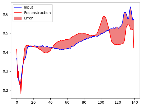 plt.fill_between(np.arange(140), decoded_data[0], normal_test_data[0], color='lightcoral')