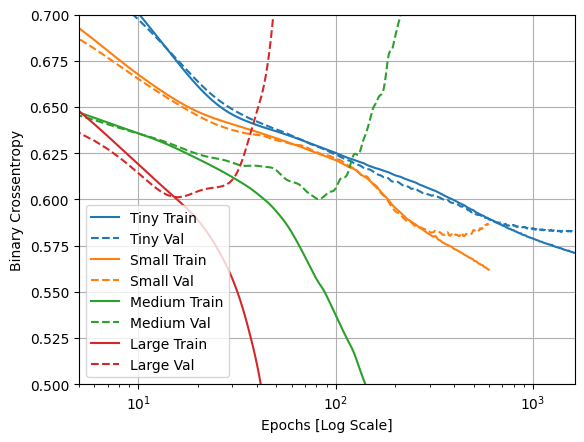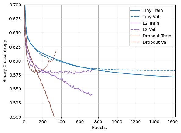 このプロットから、これらの正則化アプローチは両方とも "Large" モデルの動作を改善することが分かります。しかし、"Tiny" のベースラインと比較すると勝るものはありません。