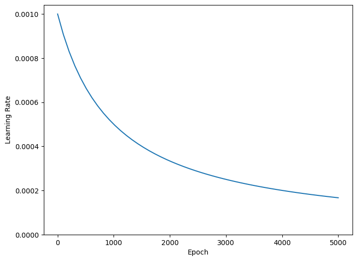 上記のコードは、tf.keras.optimizers.schedules.InverseTimeDecay を設定し、学習率を 1000 エポックで基本率の 1/2 に、2000 エポックで 1/3 に双曲線的に減少させます。