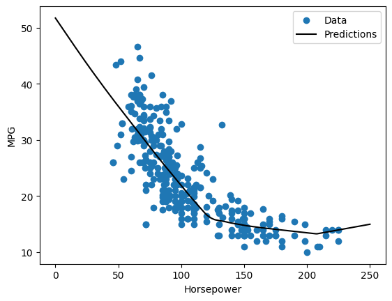 Horsepower の関数として予測をプロットすると、このモデルが非表示のレイヤーにより提供される非線形性をどのように利用するかがわかります。