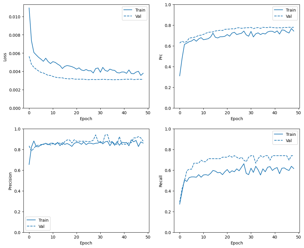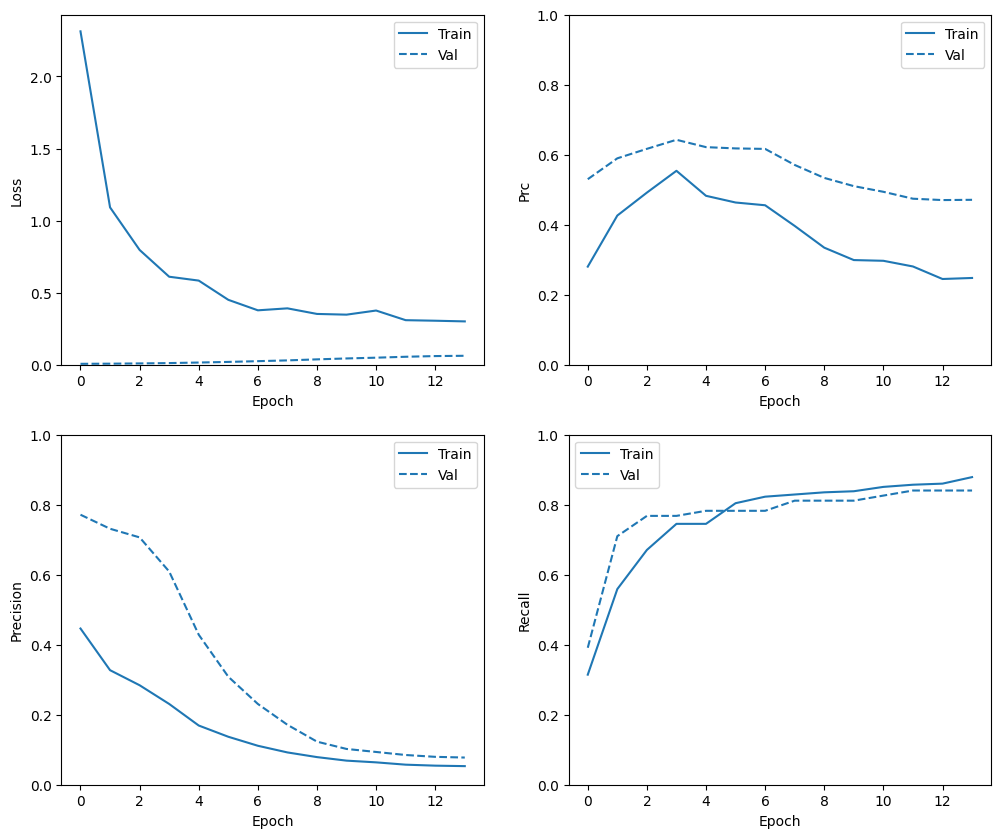 Epoch 1/1000 20/20 [==============================] - 3s 54ms/step - loss: 1.0788 - tp: 9883.0000 - fp: 5709.0000 - tn: 60165.0000 - fn: 10772.0000 - accuracy: 0.8095 - precision: 0.6339 - recall: 0.4785 - auc: 0.8187 - prc: 0.6587 - val_loss: 0.4735 - val_tp: 44.0000 - val_fp: 7517.0000 - val_tn: 37983.0000 - val_fn: 25.0000 - val_accuracy: 0.8345 - val_precision: 0.0058 - val_recall: 0.6377 - val_auc: 0.7719 - val_prc: 0.1136 Epoch 2/1000 20/20 [==============================] - 1s 29ms/step - loss: 0.6680 - tp: 13969.0000 - fp: 5680.0000 - tn: 14619.0000 - fn: 6692.0000 - accuracy: 0.6979 - precision: 0.7109 - recall: 0.6761 - auc: 0.7440 - prc: 0.8238 - val_loss: 0.4738 - val_tp: 57.0000 - val_fp: 7346.0000 - val_tn: 38154.0000 - val_fn: 12.0000 - val_accuracy: 0.8385 - val_precision: 0.0077 - val_recall: 0.8261 - val_auc: 0.8709 - val_prc: 0.3997 Epoch 3/1000 20/20 [==============================] - 1s 28ms/step - loss: 0.5201 - tp: 15755.0000 - fp: 5337.0000 - tn: 15024.0000 - fn: 4844.0000 - accuracy: 0.7514 - precision: 0.7470 - recall: 0.7648 - auc: 0.8243 - prc: 0.8789 - val_loss: 0.4438 - val_tp: 56.0000 - val_fp: 5961.0000 - val_tn: 39539.0000 - val_fn: 13.0000 - val_accuracy: 0.8689 - val_precision: 0.0093 - val_recall: 0.8116 - val_auc: 0.8914 - val_prc: 0.4917 Epoch 4/1000 20/20 [==============================] - 1s 27ms/step - loss: 0.4520 - tp: 16277.0000 - fp: 4793.0000 - tn: 15830.0000 - fn: 4060.0000 - accuracy: 0.7839 - precision: 0.7725 - recall: 0.8004 - auc: 0.8638 - prc: 0.9046 - val_loss: 0.4042 - val_tp: 57.0000 - val_fp: 4418.0000 - val_tn: 41082.0000 - val_fn: 12.0000 - val_accuracy: 0.9028 - val_precision: 0.0127 - val_recall: 0.8261 - val_auc: 0.9071 - val_prc: 0.5734 Epoch 5/1000 20/20 [==============================] - 1s 30ms/step - loss: 0.4011 - tp: 17099.0000 - fp: 3860.0000 - tn: 16322.0000 - fn: 3679.0000 - accuracy: 0.8159 - precision: 0.8158 - recall: 0.8229 - auc: 0.8896 - prc: 0.9251 - val_loss: 0.3656 - val_tp: 57.0000 - val_fp: 3142.0000 - val_tn: 42358.0000 - val_fn: 12.0000 - val_accuracy: 0.9308 - val_precision: 0.0178 - val_recall: 0.8261 - val_auc: 0.9215 - val_prc: 0.5999 Epoch 6/1000 20/20 [==============================] - 1s 28ms/step - loss: 0.3698 - tp: 17030.0000 - fp: 3437.0000 - tn: 17200.0000 - fn: 3293.0000 - accuracy: 0.8357 - precision: 0.8321 - recall: 0.8380 - auc: 0.9073 - prc: 0.9346 - val_loss: 0.3284 - val_tp: 57.0000 - val_fp: 2106.0000 - val_tn: 43394.0000 - val_fn: 12.0000 - val_accuracy: 0.9535 - val_precision: 0.0264 - val_recall: 0.8261 - val_auc: 0.9342 - val_prc: 0.6209 Epoch 7/1000 20/20 [==============================] - 1s 27ms/step - loss: 0.3450 - tp: 17393.0000 - fp: 2816.0000 - tn: 17557.0000 - fn: 3194.0000 - accuracy: 0.8533 - precision: 0.8607 - recall: 0.8449 - auc: 0.9176 - prc: 0.9426 - val_loss: 0.2964 - val_tp: 56.0000 - val_fp: 1409.0000 - val_tn: 44091.0000 - val_fn: 13.0000 - val_accuracy: 0.9688 - val_precision: 0.0382 - val_recall: 0.8116 - val_auc: 0.9453 - val_prc: 0.6271 Epoch 8/1000 20/20 [==============================] - 1s 29ms/step - loss: 0.3227 - tp: 17476.0000 - fp: 2488.0000 - tn: 17993.0000 - fn: 3003.0000 - accuracy: 0.8659 - precision: 0.8754 - recall: 0.8534 - auc: 0.9266 - prc: 0.9487 - val_loss: 0.2685 - val_tp: 57.0000 - val_fp: 1014.0000 - val_tn: 44486.0000 - val_fn: 12.0000 - val_accuracy: 0.9775 - val_precision: 0.0532 - val_recall: 0.8261 - val_auc: 0.9538 - val_prc: 0.6388 Epoch 9/1000 20/20 [==============================] - 1s 29ms/step - loss: 0.3001 - tp: 17545.0000 - fp: 2111.0000 - tn: 18430.0000 - fn: 2874.0000 - accuracy: 0.8783 - precision: 0.8926 - recall: 0.8592 - auc: 0.9358 - prc: 0.9542 - val_loss: 0.2439 - val_tp: 57.0000 - val_fp: 766.0000 - val_tn: 44734.0000 - val_fn: 12.0000 - val_accuracy: 0.9829 - val_precision: 0.0693 - val_recall: 0.8261 - val_auc: 0.9601 - val_prc: 0.6474 Epoch 10/1000 20/20 [==============================] - 1s 29ms/step - loss: 0.2841 - tp: 17588.0000 - fp: 1838.0000 - tn: 18720.0000 - fn: 2814.0000 - accuracy: 0.8864 - precision: 0.9054 - recall: 0.8621 - auc: 0.9417 - prc: 0.9580 - val_loss: 0.2229 - val_tp: 57.0000 - val_fp: 672.0000 - val_tn: 44828.0000 - val_fn: 12.0000 - val_accuracy: 0.9850 - val_precision: 0.0782 - val_recall: 0.8261 - val_auc: 0.9649 - val_prc: 0.6646 Epoch 11/1000 20/20 [==============================] - 1s 30ms/step - loss: 0.2695 - tp: 17684.0000 - fp: 1626.0000 - tn: 18962.0000 - fn: 2688.0000 - accuracy: 0.8947 - precision: 0.9158 - recall: 0.8681 - auc: 0.9472 - prc: 0.9616 - val_loss: 0.2051 - val_tp: 57.0000 - val_fp: 631.0000 - val_tn: 44869.0000 - val_fn: 12.0000 - val_accuracy: 0.9859 - val_precision: 0.0828 - val_recall: 0.8261 - val_auc: 0.9677 - val_prc: 0.6582 Epoch 12/1000 20/20 [==============================] - 1s 28ms/step - loss: 0.2608 - tp: 17838.0000 - fp: 1483.0000 - tn: 19004.0000 - fn: 2635.0000 - accuracy: 0.8995 - precision: 0.9232 - recall: 0.8713 - auc: 0.9500 - prc: 0.9639 - val_loss: 0.1904 - val_tp: 57.0000 - val_fp: 619.0000 - val_tn: 44881.0000 - val_fn: 12.0000 - val_accuracy: 0.9862 - val_precision: 0.0843 - val_recall: 0.8261 - val_auc: 0.9692 - val_prc: 0.6674 Epoch 13/1000 20/20 [==============================] - 1s 28ms/step - loss: 0.2480 - tp: 17914.0000 - fp: 1354.0000 - tn: 19123.0000 - fn: 2569.0000 - accuracy: 0.9042 - precision: 0.9297 - recall: 0.8746 - auc: 0.9548 - prc: 0.9670 - val_loss: 0.1775 - val_tp: 58.0000 - val_fp: 600.0000 - val_tn: 44900.0000 - val_fn: 11.0000 - val_accuracy: 0.9866 - val_precision: 0.0881 - val_recall: 0.8406 - val_auc: 0.9696 - val_prc: 0.6689 Epoch 14/1000 20/20 [==============================] - 1s 27ms/step - loss: 0.2393 - tp: 17851.0000 - fp: 1228.0000 - tn: 19433.0000 - fn: 2448.0000 - accuracy: 0.9103 - precision: 0.9356 - recall: 0.8794 - auc: 0.9580 - prc: 0.9687 - val_loss: 0.1656 - val_tp: 59.0000 - val_fp: 579.0000 - val_tn: 44921.0000 - val_fn: 10.0000 - val_accuracy: 0.9871 - val_precision: 0.0925 - val_reca