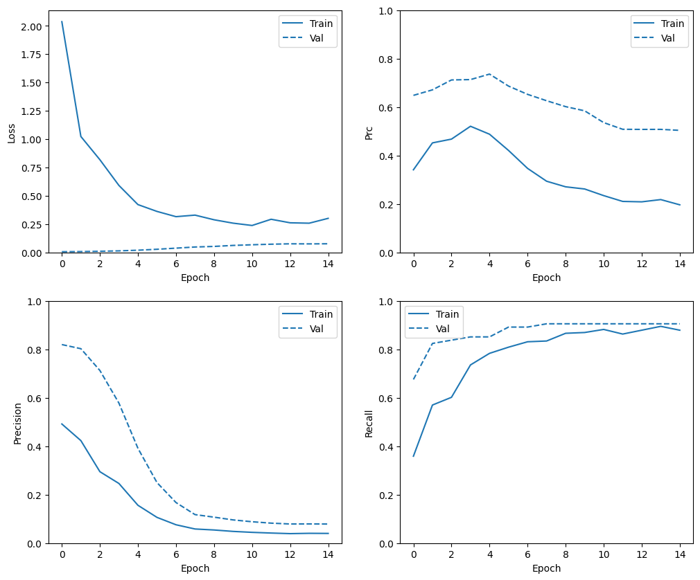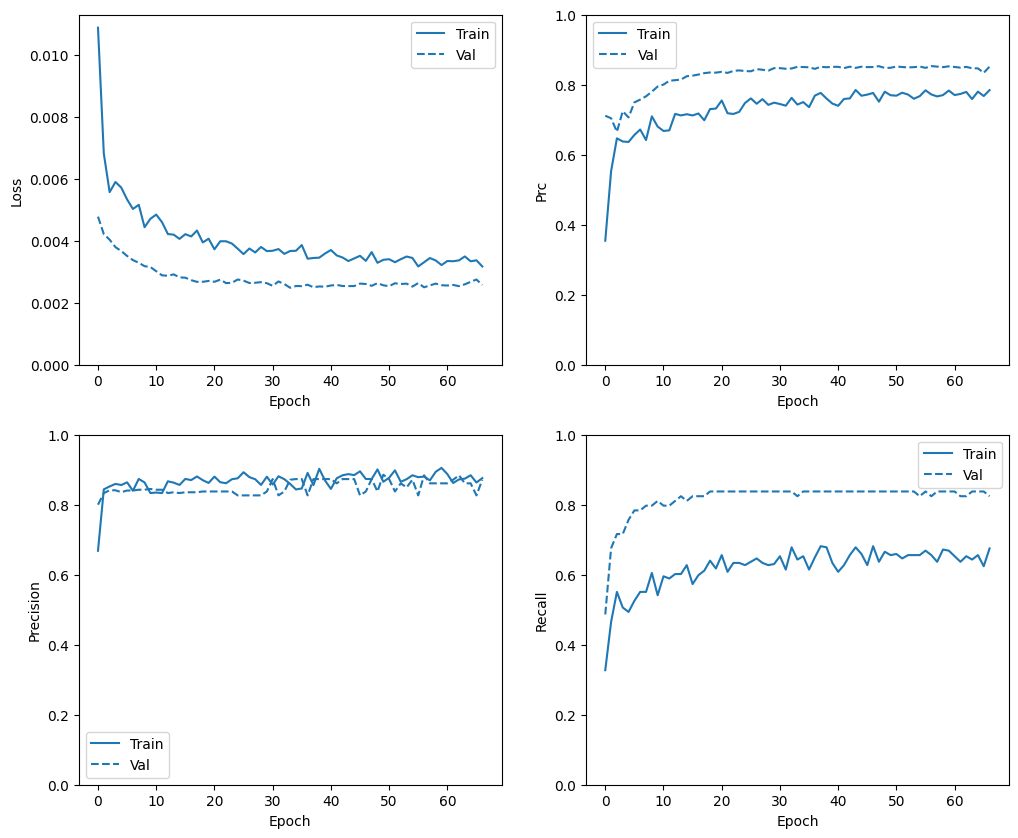Epoch 1/1000 20/20 [==============================] - 3s 56ms/step - loss: 1.1473 - tp: 11103.0000 - fp: 9113.0000 - tn: 56891.0000 - fn: 9422.0000 - accuracy: 0.7858 - precision: 0.5492 - recall: 0.5410 - auc: 0.8163 - prc: 0.6707 - val_loss: 0.6167 - val_tp: 63.0000 - val_fp: 15152.0000 - val_tn: 30343.0000 - val_fn: 11.0000 - val_accuracy: 0.6673 - val_precision: 0.0041 - val_recall: 0.8514 - val_auc: 0.8796 - val_prc: 0.4022 Epoch 2/1000 20/20 [==============================] - 1s 28ms/step - loss: 0.6997 - tp: 14659.0000 - fp: 8326.0000 - tn: 12207.0000 - fn: 5768.0000 - accuracy: 0.6559 - precision: 0.6378 - recall: 0.7176 - auc: 0.7461 - prc: 0.8279 - val_loss: 0.5798 - val_tp: 66.0000 - val_fp: 12901.0000 - val_tn: 32594.0000 - val_fn: 8.0000 - val_accuracy: 0.7167 - val_precision: 0.0051 - val_recall: 0.8919 - val_auc: 0.9219 - val_prc: 0.6033 Epoch 3/1000 20/20 [==============================] - 1s 28ms/step - loss: 0.5494 - tp: 16095.0000 - fp: 7381.0000 - tn: 13146.0000 - fn: 4338.0000 - accuracy: 0.7139 - precision: 0.6856 - recall: 0.7877 - auc: 0.8236 - prc: 0.8814 - val_loss: 0.5260 - val_tp: 68.0000 - val_fp: 9533.0000 - val_tn: 35962.0000 - val_fn: 6.0000 - val_accuracy: 0.7907 - val_precision: 0.0071 - val_recall: 0.9189 - val_auc: 0.9387 - val_prc: 0.6616 Epoch 4/1000 20/20 [==============================] - 1s 29ms/step - loss: 0.4807 - tp: 16677.0000 - fp: 6348.0000 - tn: 14147.0000 - fn: 3788.0000 - accuracy: 0.7525 - precision: 0.7243 - recall: 0.8149 - auc: 0.8587 - prc: 0.9043 - val_loss: 0.4725 - val_tp: 67.0000 - val_fp: 6386.0000 - val_tn: 39109.0000 - val_fn: 7.0000 - val_accuracy: 0.8597 - val_precision: 0.0104 - val_recall: 0.9054 - val_auc: 0.9500 - val_prc: 0.6841 Epoch 5/1000 20/20 [==============================] - 1s 29ms/step - loss: 0.4335 - tp: 17000.0000 - fp: 5508.0000 - tn: 14962.0000 - fn: 3490.0000 - accuracy: 0.7803 - precision: 0.7553 - recall: 0.8297 - auc: 0.8805 - prc: 0.9186 - val_loss: 0.4249 - val_tp: 67.0000 - val_fp: 4010.0000 - val_tn: 41485.0000 - val_fn: 7.0000 - val_accuracy: 0.9118 - val_precision: 0.0164 - val_recall: 0.9054 - val_auc: 0.9557 - val_prc: 0.7010 Epoch 6/1000 20/20 [==============================] - 1s 29ms/step - loss: 0.3995 - tp: 17406.0000 - fp: 4611.0000 - tn: 15574.0000 - fn: 3369.0000 - accuracy: 0.8052 - precision: 0.7906 - recall: 0.8378 - auc: 0.8946 - prc: 0.9295 - val_loss: 0.3864 - val_tp: 69.0000 - val_fp: 2720.0000 - val_tn: 42775.0000 - val_fn: 5.0000 - val_accuracy: 0.9402 - val_precision: 0.0247 - val_recall: 0.9324 - val_auc: 0.9581 - val_prc: 0.6994 Epoch 7/1000 20/20 [==============================] - 1s 29ms/step - loss: 0.3680 - tp: 17413.0000 - fp: 3956.0000 - tn: 16601.0000 - fn: 2990.0000 - accuracy: 0.8304 - precision: 0.8149 - recall: 0.8535 - auc: 0.9117 - prc: 0.9381 - val_loss: 0.3531 - val_tp: 69.0000 - val_fp: 1974.0000 - val_tn: 43521.0000 - val_fn: 5.0000 - val_accuracy: 0.9566 - val_precision: 0.0338 - val_recall: 0.9324 - val_auc: 0.9591 - val_prc: 0.7071 Epoch 8/1000 20/20 [==============================] - 1s 30ms/step - loss: 0.3402 - tp: 17711.0000 - fp: 3290.0000 - tn: 17159.0000 - fn: 2800.0000 - accuracy: 0.8513 - precision: 0.8433 - recall: 0.8635 - auc: 0.9238 - prc: 0.9465 - val_loss: 0.3237 - val_tp: 69.0000 - val_fp: 1614.0000 - val_tn: 43881.0000 - val_fn: 5.0000 - val_accuracy: 0.9645 - val_precision: 0.0410 - val_recall: 0.9324 - val_auc: 0.9599 - val_prc: 0.7126 Epoch 9/1000 20/20 [==============================] - 1s 29ms/step - loss: 0.3214 - tp: 17827.0000 - fp: 2886.0000 - tn: 17607.0000 - fn: 2640.0000 - accuracy: 0.8651 - precision: 0.8607 - recall: 0.8710 - auc: 0.9322 - prc: 0.9520 - val_loss: 0.2980 - val_tp: 69.0000 - val_fp: 1344.0000 - val_tn: 44151.0000 - val_fn: 5.0000 - val_accuracy: 0.9704 - val_precision: 0.0488 - val_recall: 0.9324 - val_auc: 0.9608 - val_prc: 0.7262 Epoch 10/1000 20/20 [==============================] - 1s 29ms/step - loss: 0.3009 - tp: 18039.0000 - fp: 2543.0000 - tn: 17866.0000 - fn: 2512.0000 - accuracy: 0.8766 - precision: 0.8764 - recall: 0.8778 - auc: 0.9395 - prc: 0.9576 - val_loss: 0.2754 - val_tp: 69.0000 - val_fp: 1179.0000 - val_tn: 44316.0000 - val_fn: 5.0000 - val_accuracy: 0.9740 - val_precision: 0.0553 - val_recall: 0.9324 - val_auc: 0.9628 - val_prc: 0.7284 Epoch 11/1000 20/20 [==============================] - 1s 29ms/step - loss: 0.2860 - tp: 18124.0000 - fp: 2217.0000 - tn: 18200.0000 - fn: 2419.0000 - accuracy: 0.8868 - precision: 0.8910 - recall: 0.8822 - auc: 0.9455 - prc: 0.9613 - val_loss: 0.2564 - val_tp: 69.0000 - val_fp: 1075.0000 - val_tn: 44420.0000 - val_fn: 5.0000 - val_accuracy: 0.9763 - val_precision: 0.0603 - val_recall: 0.9324 - val_auc: 0.9656 - val_prc: 0.7330 Epoch 12/1000 20/20 [==============================] - 1s 30ms/step - loss: 0.2730 - tp: 18217.0000 - fp: 2016.0000 - tn: 18415.0000 - fn: 2312.0000 - accuracy: 0.8943 - precision: 0.9004 - recall: 0.8874 - auc: 0.9504 - prc: 0.9644 - val_loss: 0.2392 - val_tp: 69.0000 - val_fp: 1017.0000 - val_tn: 44478.0000 - val_fn: 5.0000 - val_accuracy: 0.9776 - val_precision: 0.0635 - val_recall: 0.9324 - val_auc: 0.9680 - val_prc: 0.7343 Epoch 13/1000 20/20 [==============================] - 1s 31ms/step - loss: 0.2616 - tp: 18205.0000 - fp: 1788.0000 - tn: 18682.0000 - fn: 2285.0000 - accuracy: 0.9006 - precision: 0.9106 - recall: 0.8885 - auc: 0.9542 - prc: 0.9668 - val_loss: 0.2235 - val_tp: 69.0000 - val_fp: 963.0000 - val_tn: 44532.0000 - val_fn: 5.0000 - val_accuracy: 0.9788 - val_precision: 0.0669 - val_recall: 0.9324 - val_auc: 0.9710 - val_prc: 0.7393 Epoch 14/1000 20/20 [==============================] - 1s 33ms/step - loss: 0.2495 - tp: 18265.0000 - fp: 1585.0000 - tn: 18898.0000 - fn: 2212.0000 - accuracy: 0.9073 - precision: 0.9202 - recall: 0.8920 - auc: 0.9573 - prc: 0.9690 - val_loss: 0.2101 - val_tp: 68.0000 - val_fp: 952.0000 - val_tn: 44543.0000 - val_fn: 6.0000 - val_accuracy: 0.9790 - val_precision: 0.0667 - val_recall: 0.9