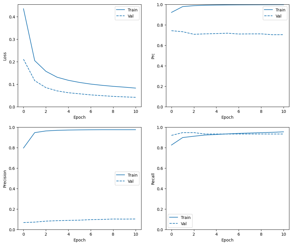 Epoch 1/100 278/278 [==============================] - 9s 25ms/step - loss: 0.4348 - tp: 235044.0000 - fp: 60383.0000 - tn: 280909.0000 - fn: 49970.0000 - accuracy: 0.8238 - precision: 0.7956 - recall: 0.8247 - auc: 0.9020 - prc: 0.9208 - val_loss: 0.2105 - val_tp: 68.0000 - val_fp: 944.0000 - val_tn: 44551.0000 - val_fn: 6.0000 - val_accuracy: 0.9792 - val_precision: 0.0672 - val_recall: 0.9189 - val_auc: 0.9713 - val_prc: 0.7421 Epoch 2/100 278/278 [==============================] - 7s 24ms/step - loss: 0.2044 - tp: 255378.0000 - fp: 14590.0000 - tn: 270323.0000 - fn: 29053.0000 - accuracy: 0.9233 - precision: 0.9460 - recall: 0.8979 - auc: 0.9713 - prc: 0.9775 - val_loss: 0.1154 - val_tp: 70.0000 - val_fp: 911.0000 - val_tn: 44584.0000 - val_fn: 4.0000 - val_accuracy: 0.9799 - val_precision: 0.0714 - val_recall: 0.9459 - val_auc: 0.9737 - val_prc: 0.7321 Epoch 3/100 278/278 [==============================] - 7s 24ms/step - loss: 0.1569 - tp: 259317.0000 - fp: 10136.0000 - tn: 274474.0000 - fn: 25417.0000 - accuracy: 0.9376 - precision: 0.9624 - recall: 0.9107 - auc: 0.9842 - prc: 0.9865 - val_loss: 0.0844 - val_tp: 70.0000 - val_fp: 794.0000 - val_tn: 44701.0000 - val_fn: 4.0000 - val_accuracy: 0.9825 - val_precision: 0.0810 - val_recall: 0.9459 - val_auc: 0.9722 - val_prc: 0.7070 Epoch 4/100 278/278 [==============================] - 7s 24ms/step - loss: 0.1306 - tp: 262548.0000 - fp: 8590.0000 - tn: 276185.0000 - fn: 22021.0000 - accuracy: 0.9462 - precision: 0.9683 - recall: 0.9226 - auc: 0.9899 - prc: 0.9907 - val_loss: 0.0699 - val_tp: 69.0000 - val_fp: 738.0000 - val_tn: 44757.0000 - val_fn: 5.0000 - val_accuracy: 0.9837 - val_precision: 0.0855 - val_recall: 0.9324 - val_auc: 0.9745 - val_prc: 0.7112 Epoch 5/100 278/278 [==============================] - 7s 24ms/step - loss: 0.1170 - tp: 263962.0000 - fp: 7829.0000 - tn: 276956.0000 - fn: 20597.0000 - accuracy: 0.9501 - precision: 0.9712 - recall: 0.9276 - auc: 0.9923 - prc: 0.9926 - val_loss: 0.0618 - val_tp: 69.0000 - val_fp: 713.0000 - val_tn: 44782.0000 - val_fn: 5.0000 - val_accuracy: 0.9842 - val_precision: 0.0882 - val_recall: 0.9324 - val_auc: 0.9763 - val_prc: 0.7139 Epoch 6/100 278/278 [==============================] - 7s 24ms/step - loss: 0.1074 - tp: 266098.0000 - fp: 7432.0000 - tn: 276960.0000 - fn: 18854.0000 - accuracy: 0.9538 - precision: 0.9728 - recall: 0.9338 - auc: 0.9937 - prc: 0.9938 - val_loss: 0.0570 - val_tp: 69.0000 - val_fp: 693.0000 - val_tn: 44802.0000 - val_fn: 5.0000 - val_accuracy: 0.9847 - val_precision: 0.0906 - val_recall: 0.9324 - val_auc: 0.9777 - val_prc: 0.7176 Epoch 7/100 278/278 [==============================] - 7s 24ms/step - loss: 0.1001 - tp: 267557.0000 - fp: 7203.0000 - tn: 277084.0000 - fn: 17500.0000 - accuracy: 0.9566 - precision: 0.9738 - recall: 0.9386 - auc: 0.9946 - prc: 0.9946 - val_loss: 0.0521 - val_tp: 69.0000 - val_fp: 652.0000 - val_tn: 44843.0000 - val_fn: 5.0000 - val_accuracy: 0.9856 - val_precision: 0.0957 - val_recall: 0.9324 - val_auc: 0.9790 - val_prc: 0.7097 Epoch 8/100 278/278 [==============================] - 7s 24ms/step - loss: 0.0947 - tp: 268874.0000 - fp: 7028.0000 - tn: 276906.0000 - fn: 16536.0000 - accuracy: 0.9586 - precision: 0.9745 - recall: 0.9421 - auc: 0.9952 - prc: 0.9950 - val_loss: 0.0488 - val_tp: 69.0000 - val_fp: 638.0000 - val_tn: 44857.0000 - val_fn: 5.0000 - val_accuracy: 0.9859 - val_precision: 0.0976 - val_recall: 0.9324 - val_auc: 0.9799 - val_prc: 0.7108 Epoch 9/100 278/278 [==============================] - 7s 25ms/step - loss: 0.0902 - tp: 269135.0000 - fp: 7035.0000 - tn: 277727.0000 - fn: 15447.0000 - accuracy: 0.9605 - precision: 0.9745 - recall: 0.9457 - auc: 0.9956 - prc: 0.9954 - val_loss: 0.0455 - val_tp: 69.0000 - val_fp: 610.0000 - val_tn: 44885.0000 - val_fn: 5.0000 - val_accuracy: 0.9865 - val_precision: 0.1016 - val_recall: 0.9324 - val_auc: 0.9807 - val_prc: 0.7111 Epoch 10/100 278/278 [==============================] - 7s 24ms/step - loss: 0.0865 - tp: 270473.0000 - fp: 7086.0000 - tn: 277235.0000 - fn: 14550.0000 - accuracy: 0.9620 - precision: 0.9745 - recall: 0.9490 - auc: 0.9959 - prc: 0.9957 - val_loss: 0.0433 - val_tp: 69.0000 - val_fp: 615.0000 - val_tn: 44880.0000 - val_fn: 5.0000 - val_accuracy: 0.9864 - val_precision: 0.1009 - val_recall: 0.9324 - val_auc: 0.9812 - val_prc: 0.7028 Epoch 11/100 276/278 [============================>.] - ETA: 0s - loss: 0.0824 - tp: 269530.0000 - fp: 6996.0000 - tn: 275642.0000 - fn: 13080.0000 - accuracy: 0.9645 - precision: 0.9747 - recall: 0.9537 - auc: 0.9963 - prc: 0.9961Restoring model weights from the end of the best epoch: 1. 278/278 [==============================] - 7s 24ms/step - loss: 0.0823 - tp: 271452.0000 - fp: 7062.0000 - tn: 277672.0000 - fn: 13158.0000 - accuracy: 0.9645 - precision: 0.9746 - recall: 0.9538 - auc: 0.9963 - prc: 0.9961 - val_loss: 0.0412 - val_tp: 69.0000 - val_fp: 607.0000 - val_tn: 44888.0000 - val_fn: 5.0000 - val_accuracy: 0.9866 - val_precision: 0.1021 - val_recall: 0.9324 - val_auc: 0.9816 - val_prc: 0.7035 Epoch 11: early stopping
