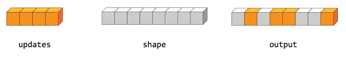 The simplest form of the scatter op is to insert individual elements in a tensor by index. Consider an example where you want to insert 4 scattered elements in a rank-1 tensor with 8 elements.